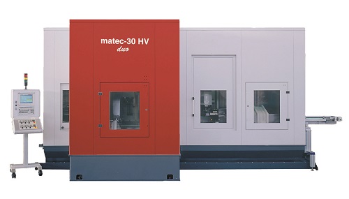 Die matec-30 HV duo ist eine Langbettmaschine auf Basis der matec-30 L duo. Sie hat 2 unabhängige Fahrständer mit Schwenkkopf (2 x 4 Achsen). Dies ermöglicht die getrennte 2 x 3-Seitenbearbeitung an einem Werkstück durch Übergabe des Werkstücks an die Gegenspindel. Eine Automation mit NC-Greifer legt das Werkstück nach Fertigstellung auf ein Transportband ab.